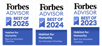 We’re proud that Forbes Advisor listed Habitat for Humanity as one of the best vehicle donation programs! The ranking was based on the efficiency and impact our vehicle donation program has on our mission. This means each dollar from your vehicle donation will make an even greater impact right here in our community!